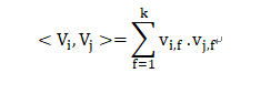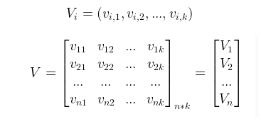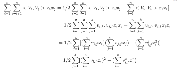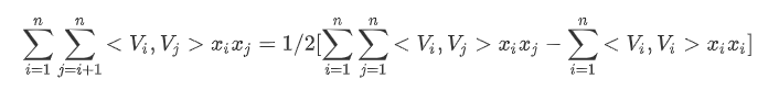 由于直接在交叉项 x_i,x_j 的前面加上交叉系数 w_{ij }的方式,在观察样本中未出现交互的特征分量时,不能对相应的参数进行估计,故文章作者引入了辅助向量V_i=(v_{i1},v_{i2}, ..., v_{ik})利用<V_i,V_j>来对w{i,j}进行估计: