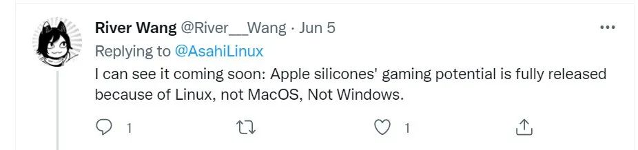推特上不少用户也表示对这样的进展喜闻乐见,纷纷感叹 Asahi Linux 团队进展之神速。正如用户 River Wang所说:“在不远的将来,我可以看到基于苹果芯片的游戏潜力被完全释放,而这正是因为 Linux,而不是 macOS,也不是 Windows。”