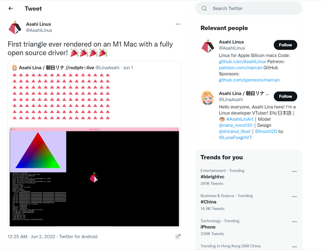参考资料:https://www.phoronix.com/scan.php?page=news_item&px=Asahi-Linux-First-Triangle