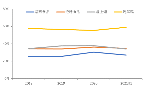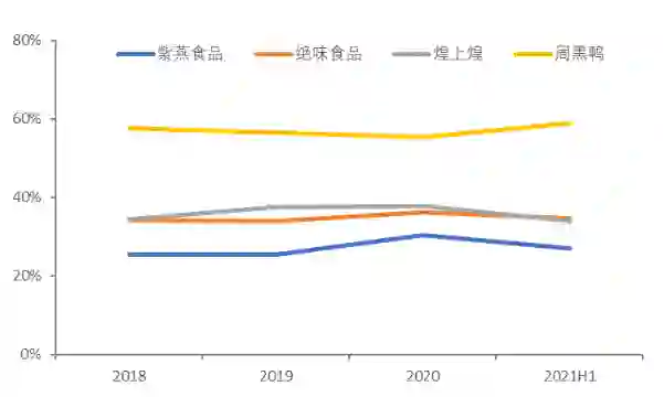 与采用直营模式或直接加盟的“卤味三巨头”相比,紫燕食品在“公司—经销商—终端加盟门店—消费者”的两级销售渠道下,从出厂到终端的利润,公司还要与经销商和加盟店之间进行分配,会进一步压低紫燕食品的毛利空间,这也是紫燕毛利率明显低于“卤味三巨头”的原因之一。