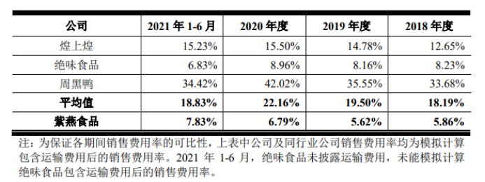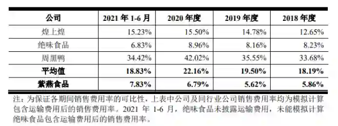 2018-2021H1紫燕食品与同行销售费用率对比 资料来源:紫燕食品招股说明书,36氪整理
