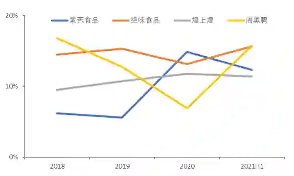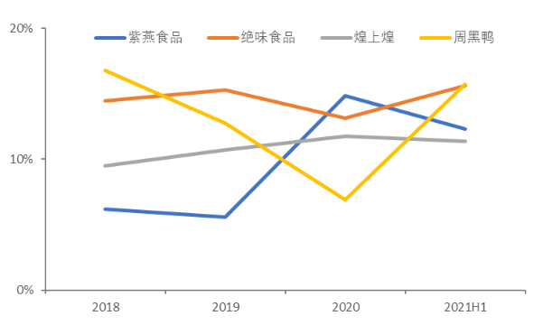 费用方面,相较于“卤味三巨头”,紫燕食品的期间费用率整体较低。由于2021年会计准则变化,原本归属于销售费用科目的运输费用重分类至营业成本,为保证数据的可比性,将2020年和2021年上半年的运输费用包含在销售费用率内,经计算得,2020年紫燕食品调整后的销售费用率仅为6.79%,大幅低于同期周黑鸭和煌上煌的42.2%和15.5%。
