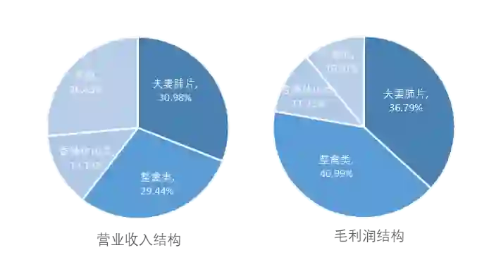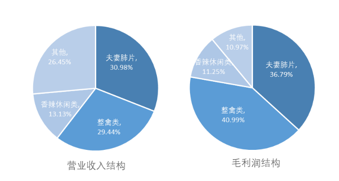 营收结构方面,以佐餐卤制品为主,休闲卤制品为辅的紫燕食品,鲜货食品占据9成左右,拥有夫妻肺片等明星爆款单品,整禽类(百味鸡、藤椒鸡、甜皮鸭、熏香卤鹅)也常常成为消费者喜爱的“下酒菜”。大单品夫妻肺片的营收占比常年达3成以上,接着是整禽类营收占比近30%。也就是说这两类产品撑起了紫燕食品的半壁江山。而且二者的毛利占比更是接近8成,其中,2020年夫妻肺片毛利占比约37%,而整禽类毛利占比超40%。