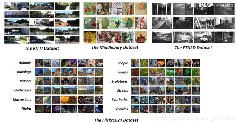 数据集方面,双目视觉领域现有的数据集(例如KITTI数据集、Middlebury数据集以及ETH3D数据集)更多地针对深度估计与光流估计等任务,在场景数量、场景多样性以及图像质量等方面无法满足双目超分辨算法的需求。因此,笔者在这个工作中收集了1024幅双目图像,构建并公开了一个大型双目图像超分辨数据集Flickr1024,用于对双目超分辨算法进行训练和评估。