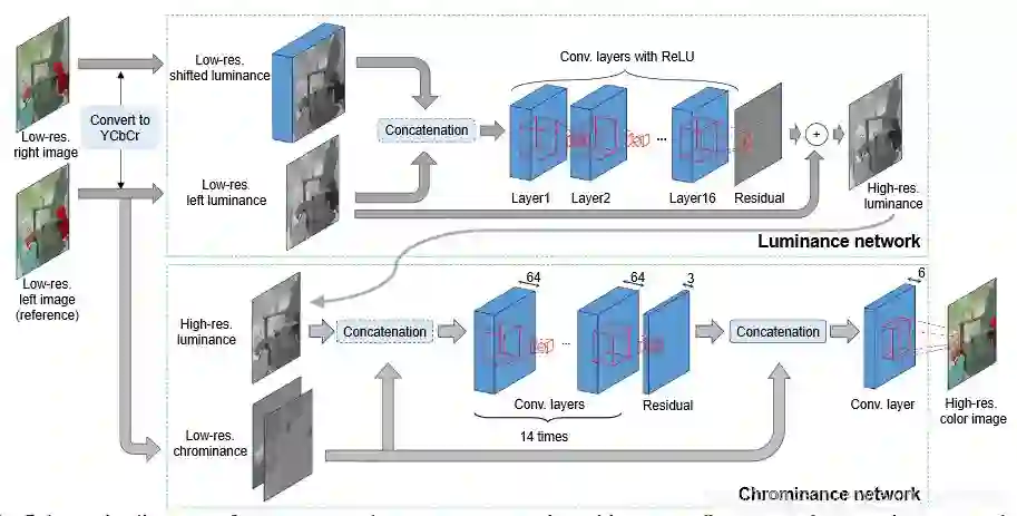 StereoSR在解决双目图像视差方面的思路为:将右图水平移动不同像素,生成64张副本图像,将其与左图级联后送入网络进行重建。对于图像中的任一区域(前提是视差不太大),左图总会和移动某个像素值之后的右图对应,从而对左右图的互补信息进行利用。其网络结构类似于单图超分辨网络VDSR,在生成高分辨率Y通道图像后,该算法又利用另外一个子网络去学习YCbCr到RGB的转换。StereoSR是双目图像超分辨领域一个比较初级的奠基性的工作,实验结果也仅仅展示了其性能优于SISR网络SRCNN 与 VDSR。
