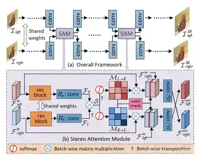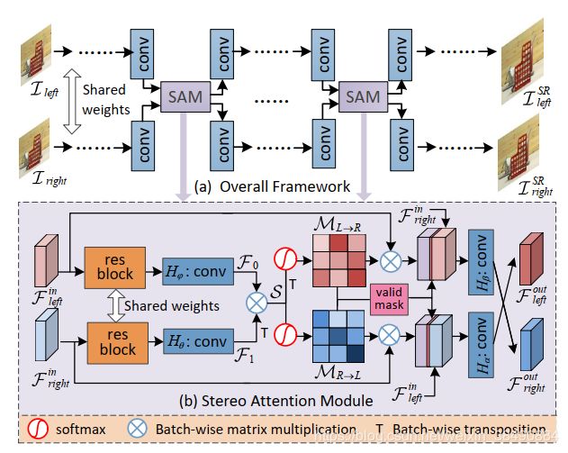 此处介绍笔者所在课题组的一个最新工作,相关论文 A Stereo Attention Module for Stereo Image Super-Resolution 已被 IEEE Signal Processing Letters 期刊录用。该文首先分析了双目图像超分辨任务面临的挑战(见本文第三节),而后针对这些挑战提出了一个通用的模块 Stereo Attention Module(SAM)。论文将多个SAM安插至现有的单图超分辨网络中,并在双目图像数据集上进行微调,从而实现在原有单图超分辨网络的基础上多次交互并利用左右图的信息,达到了很好的双目图像超分辨性能。SAM的结构图如下所示: