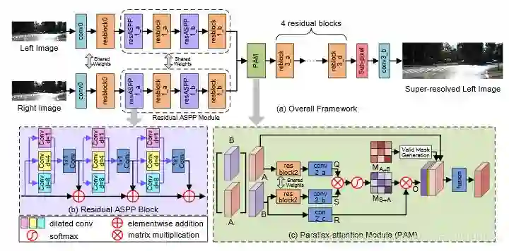 PASSRnet 出自笔者所在课题组,前期已有公众号对该工作进行了报道,内容见链接。相比于StereoSR,PASSRnet的网络设计更加精巧,巧妙地将注意力机制引入到双目视觉中并提出“视差注意力机制”,其网络结构如下: