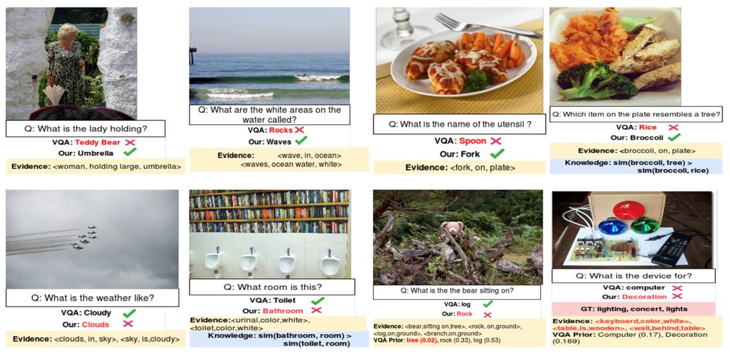 将文本或图像, 以及在图像中抽取的一系列信息, 如场景图谱(SceneGraph), 图片标题(Image Caption)等视为是”知识来源”, 在给定一个问题时,如何综合考虑所有的知识,并推断出最后的答案.