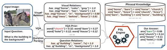 本文提出的主要模型,是一个基于一阶谓词概率软逻辑(Probabilistic Soft Logic)的显式推理机. 如果你已经训练好了一个用于视觉问答的神经网络模型,那么这个显式推理机可以根据模型的输出结果, 综合考虑信息后,更正原本模型的输出结果. 这样的后处理能提升模型的精度.下图就是一个这样的例子.