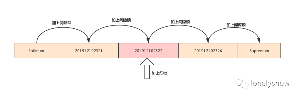 order_no 上没有索引,innoDB 将会在主键索引上全表扫描,这里并没有加表锁,而是将所有的记录都会加上行级排他锁,而实际上 innoDB 内部做了优化,当扫描到一行记录后发现不匹配就会把锁给释放,当然这个违背了 2PL 原则在事务提交的时候释放。这里除了对记录进行加锁,还会对每两个记录之间的间隙加锁,所以最终将会保存所有的间隙锁和 order_no = '201912102322' 的行锁。
