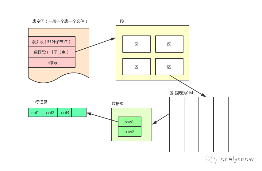 有了以上的索引知识我们在来分析数据是怎么存储的,InnoDB 存储引擎的逻辑存储结构从大到小依次可以分为:表空间、段、区、页、行。