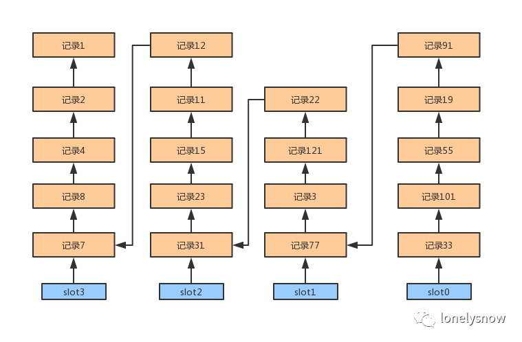页目录里维护多个 slot ,一个 slot 包含多个行记录。每个 slot 占 2 个字节,记录这个 slot 里的行记录相对页初始位置的偏移量。由于索引只能定位到数据页,而定位到数据页内的行记录还需要在内存中进行二分查找,而这个二分查找就需要借助 slot 信息,先找到对应的 slot ,然后在 slot 内部通过数据行中记录头里的下一个记录地址进行遍历。每一个 slot 可以包含 4 到 8 个数据行。如果没有 slot 辅助,链表本身是无法进行二分查找的。