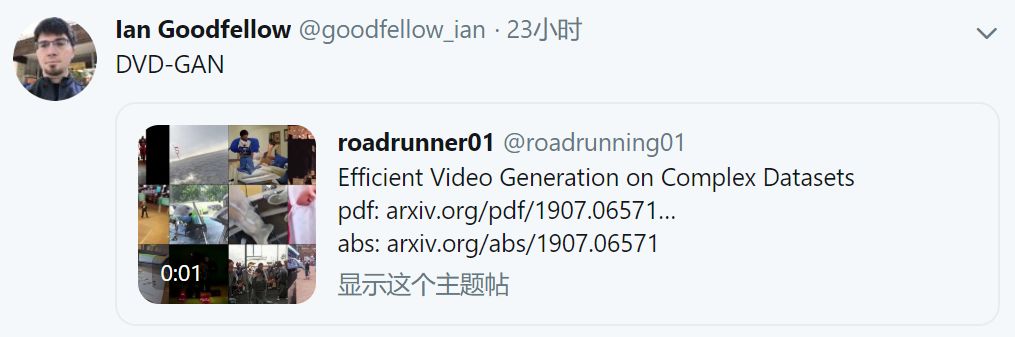 DeepMind 提出的模型叫作 Dual Video Discriminator GAN (DVD-GAN),可以利用计算高效的判别器分解,扩展到时间更长、分辨率更高的视频。该研究是迈向逼真视频生成的一次探索,连 Ian Goodfellow 也转推了这篇论文。