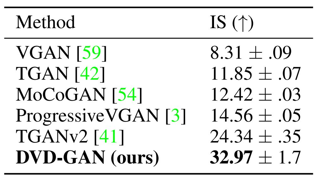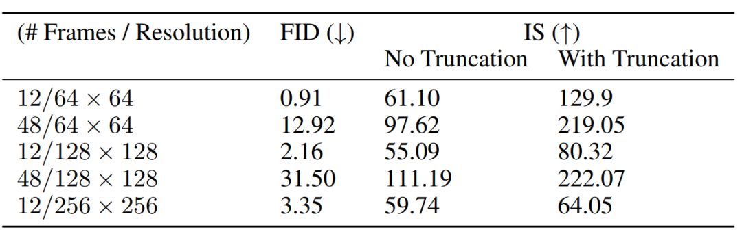 表 1:DVD-GAN 在 Kinetics-600 视频合成任务中的 FID/IS 得分。
