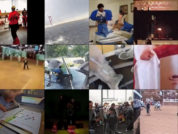 DVD-GAN 在 12 帧 128 × 128 Kinetics-600 样本上训练得到的视频帧。