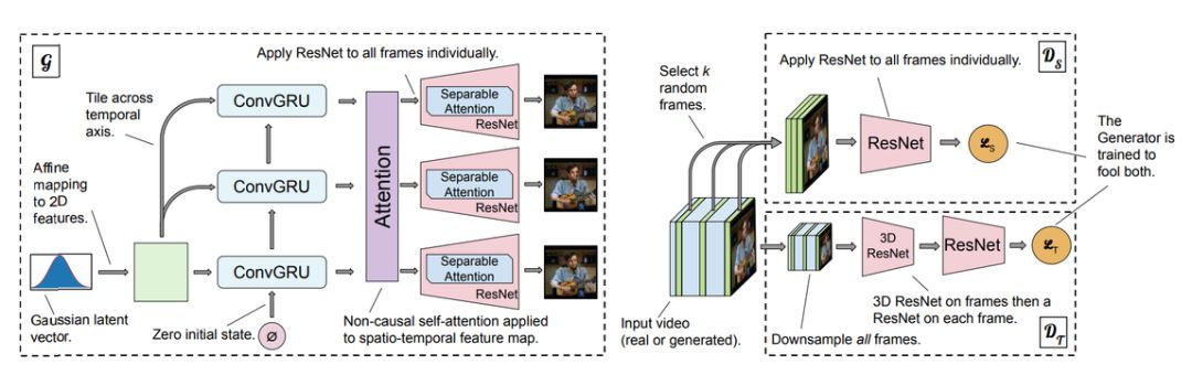 图 3:DVD-GAN 模型架构图示。左图为生成器,右图为判别器(D_S/D_T)。