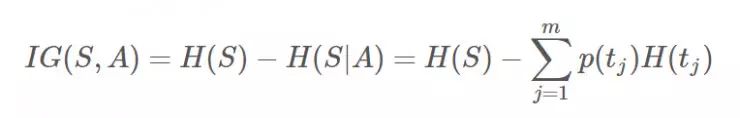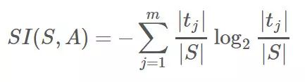 这里,在属性A的条件下,数据被划分成m个类别(例如,属性A是体重,有轻、中、重三个选项,那么m=3),p(tj)表示类别tj(属性A中所有具有第j个特性的所有数据)的数量与S总数量的比值,H(tj)表示子类别tj的熵。