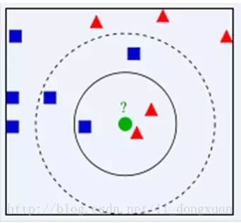 如上图,绿色圆要被决定赋予哪个类,是红色三角形还是蓝色四方形?如果K=3,由于红色三角形所占比例为2/3,绿色圆将被赋予红色三角形那个类,如果K=5,由于蓝色四方形比例为3/5,因此绿色圆被赋予蓝色四方形类。