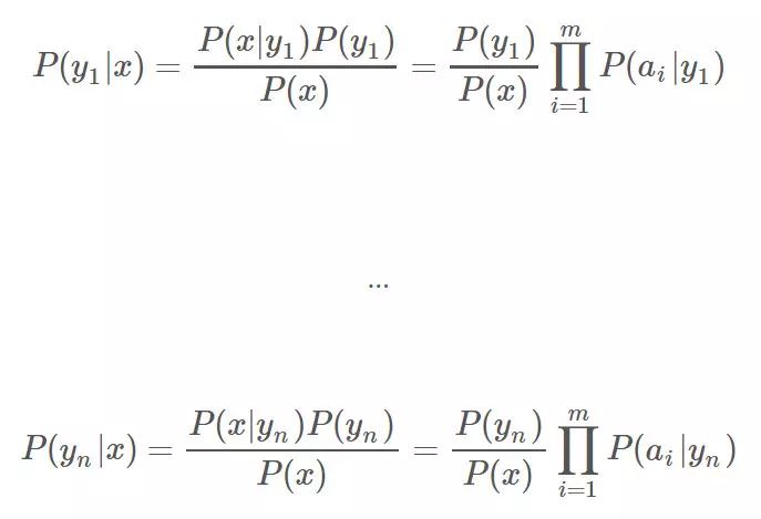 (3)依次计算x属于各项分类的条件概率,即计算P(y1∥x),P(y2∥x),… ,P(yn∥x):