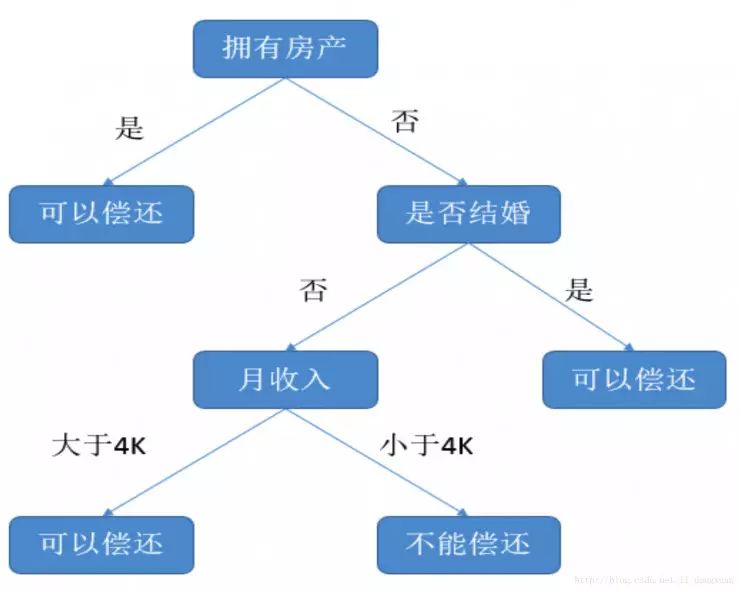 决策树是一种常见的分类方法,其思想和“人类逐步分析比较然后作出结论”的过程十分相似。决策过程和下图类似。