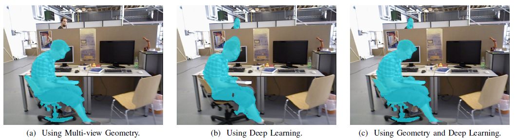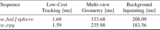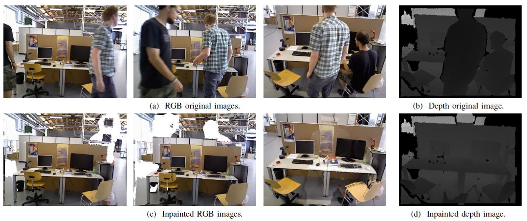 作者将之前20关键帧的RGB以及深度图投影到当前帧上完成无动态物体的背景修复。值得注意的是,由于在其他帧中再也没有出现过当前帧中的场景或者深度信息无效造成投影失败,会导致结果中不可修复裂痕的出现。一旦出现这种情况则还需要另寻他法。图5显示了从不同TUM基准序列中得到人工合成影像。利用这些经过修复的影像可以得到满足静态场景假设的SLAM效果。