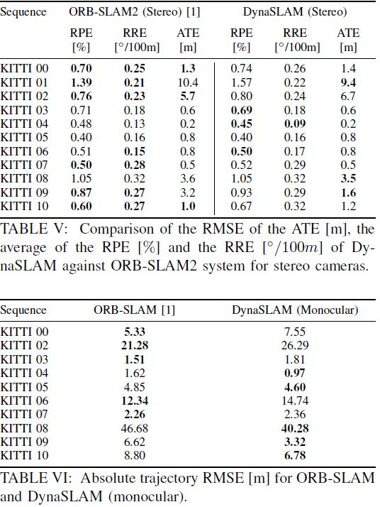 表5、6 双目条件下DynaSLAM和ORB-SLAM之间的比较以及单目下DynaSLAM和ORB-SLAM之间的比较结果