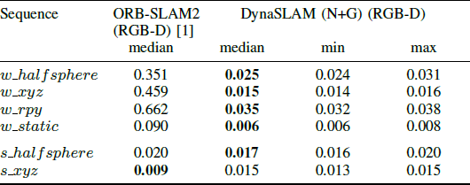 作者还将DynaSLAM(N+G)中RGB-D分支与RGB-D ORB-SLAM2进行了对比。可以发现在高动态场景walking中,本文的方法优于ORB-SLAM2,并且误差与RGB-D ORB-SLAM2在静态场景中的误差相近。而在低动态场景setting中,要稍微差一些。