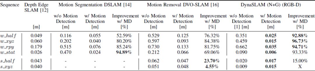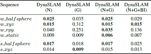 DynaSLAM (N)代表仅使用Mask RCNN进行动态物体分割; DynaS LAM (G)代表仅使用基于深度变化的多视几何进行动态检测和分割;DynaSLAM (N+G)代表同时利用多视几何和深度学习的方法进行检测;DynaSLAM (N+G+BI)代表在背景修复之后进行跟踪和建图的操作(这时是基于真实影像和重建影像完成ORB特征提取)。从表中可以发现使用DynaSLAM(N+G)的精度是最高的,DynaSLAM (G) 由于在经过一定的延迟之后运动估计和实例分割才会准确这一方法特性,使得最后的精度较差。DynaSLAM (N+G+BI)由于使用了重建之后的影像进行跟踪,而相机姿态会对重建影像有较大影响,因此这样的效果比较差。