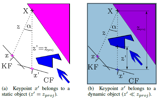 对于每一个输入影像帧,作者选择一些与其重叠度最大的旧影像帧(文中作者选择数量为5),将这些旧影像帧上的关键点x投影到当前帧上得到特征点x',以及其投影深度zproj,同时生成对应的三维点X。计算关键点x,x'与三维点X形成的夹角xXx', 记为Alpha,若Alpha大于30度则认为该点可能被挡住了,即不对其做处理。作者观察到在TUM数据集中,夹角Alpha大于30°时的静态物体即被认为是动态的。单目、双目情况下,作者使用深度测量计得到x'对应的深度值z',在误差允许的范围内,将其与zproj进行比较,超过一定阈值则认为该点x'对应于一个动态的物体。判断过程如图3所示。作者经过在TUM数据集上进行的测试发现深度值差阈值为0.4m时,表达式0.7*Precision +0.3* Recall达到最大。