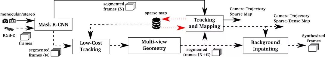 对于RGB-D相机而言,将RGB-D数据传入到CNN网络中对有先验动态性质的物体如行人和车辆进行逐像素的分割。作者使用多视几何在两方面提升动态内容的分割效果。首先作者对CNN输出的动态物体的分割结果进行修缮;其次,将在大多数时间中保持静止的、新出现的动态对象进行标注。对于单目和双目相机,则直接将图像传入CNN中进行分割,将具有先验动态信息的物体分割出去,仅使用剩下的图像进行跟踪和建图处理。