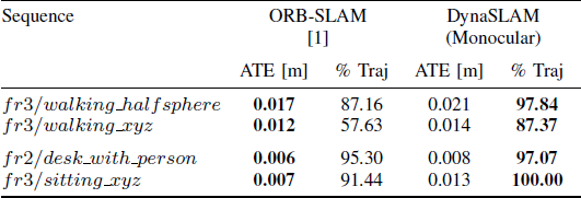 表4 ORB-SLAM和单目DynaSLAM在TUM数据集上