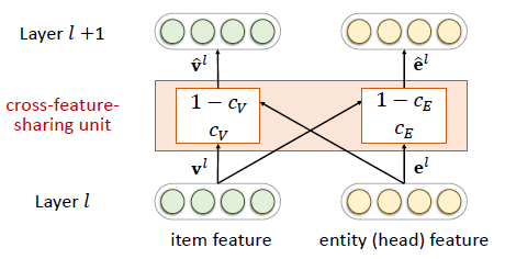 由于推荐系统中的物品和知识图谱中的实体存在重合,所以两个任务并非相互独立。我们在两个任务中设计了交叉特征共享单元(cross-feature-sharing units)作为两者的连接纽带。