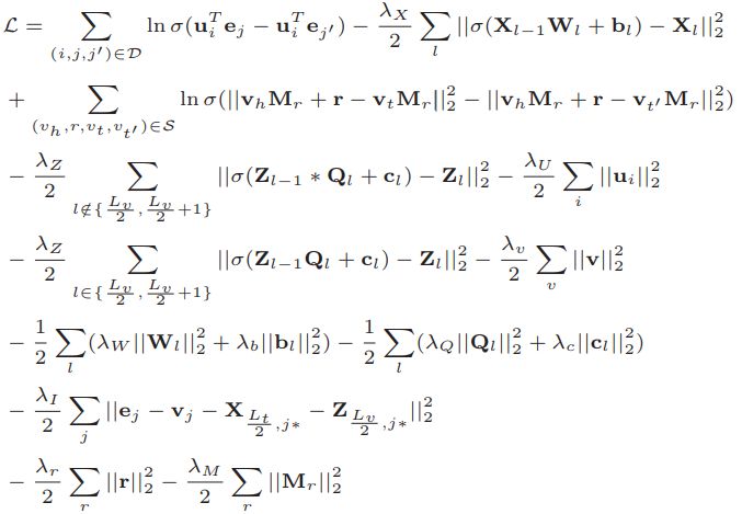 我们将三种知识学习的目标函数与推荐系统中的协同过滤结合,得到如下的联合损失函数: