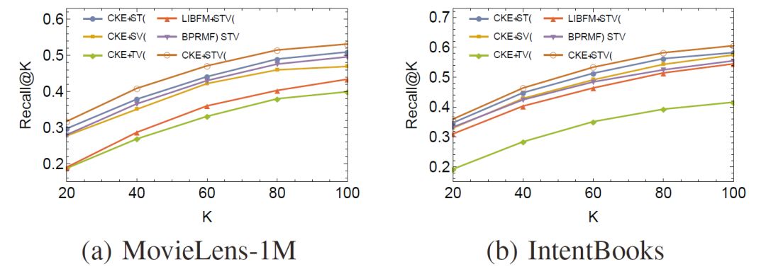 使用诸如随机梯度下降(SGD)的方法对上述损失函数进行训练,我们最终可以得到用户/物品向量,以及实体/关系向量。CKE在电影推荐和图书推荐上取得了很高的Recall值和MAP值: