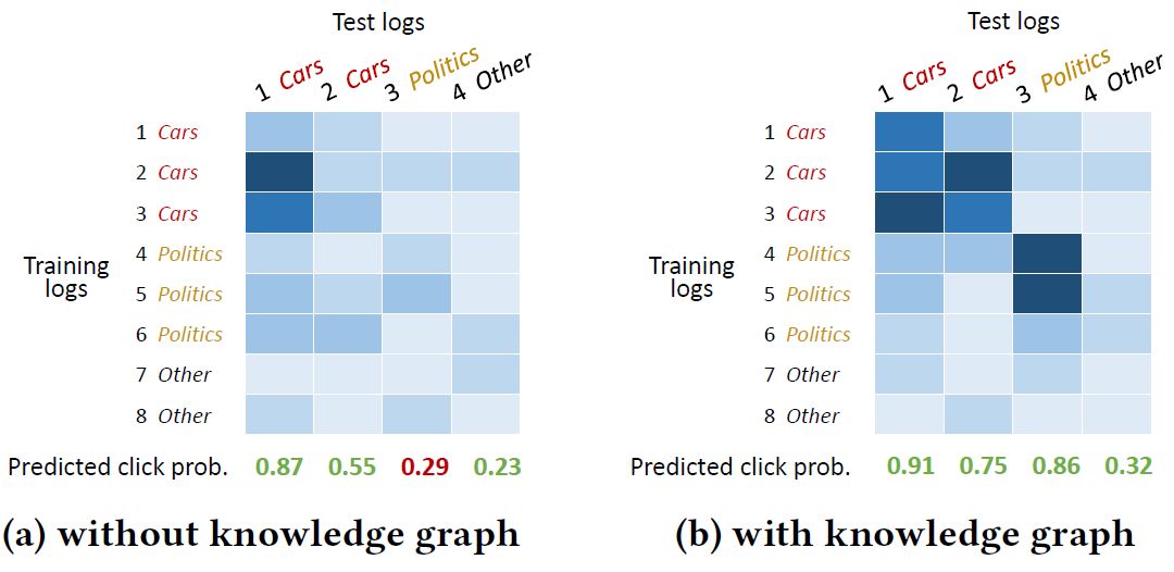 我们也可以通过注意力权重的可视化结果看出,注意力机制的引入对模型的最后输出产生了积极的影响。由于注意力机制的引入,DKN可以更好地将同类别的新闻联系起来,从而提高了最终的正确预测的数量: