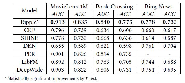 类似于CKE,我们在该损失函数上训练即可得到物品向量和实体向量。需要注意的是,Ripple Network中没有对用户直接使用向量进行刻画,而是用用户点击过的物品的向量集合作为其特征。Ripple Network在电影、图书和新闻的点击率预测上取得了非常好的效果: