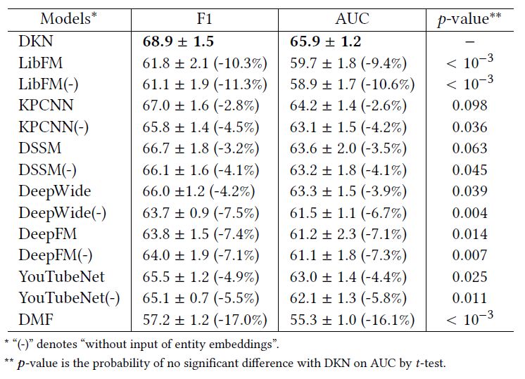 该模型在新闻推荐上取得了很好的效果:DKN取得了0.689的F1值和0.659的AUC值,并在p=0.1水平上比其它方法取得了显著的提升。