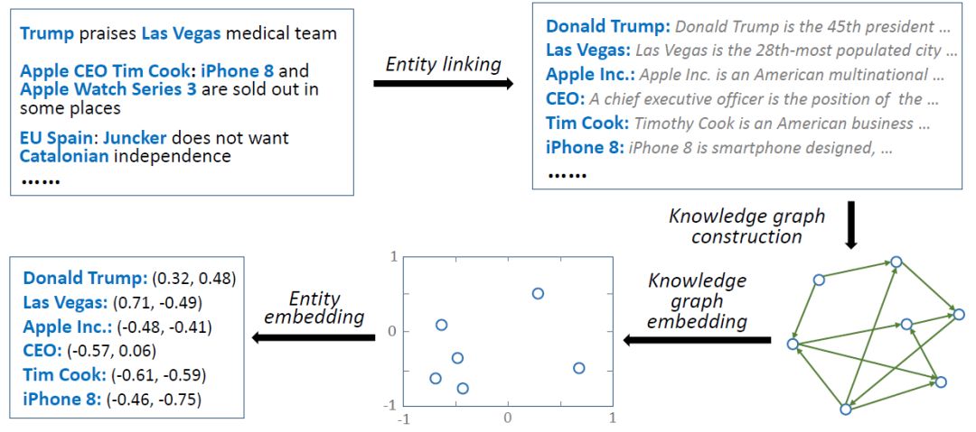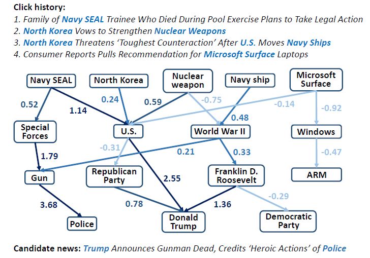 我们以新闻推荐[1]为例来介绍依次学习。如下图所示,新闻标题和正文中通常存在大量的实体,实体间的语义关系可以有效地扩展用户兴趣。然而这种语义关系难以被传统方法(话题模型、词向量)发掘。