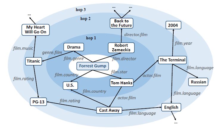 下图展示了用户兴趣在知识图谱上扩散的过程。以一个用户看过的“Forrest Gump”为中心,用户的兴趣沿着关系边可以逐跳向外扩展,并在扩展过程中兴趣强度逐渐衰减。