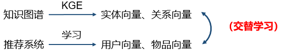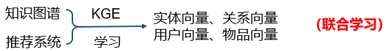 依次学习(one-by-one learning)。首先使用知识图谱特征学习得到实体向量和关系向量,然后将这些低维向量引入推荐系统,学习得到用户向量和物品向量;