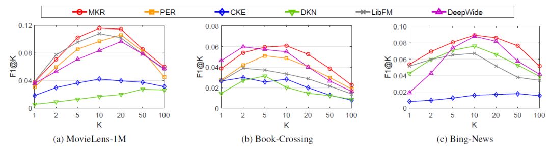 MKR在电影、图书和新闻推荐上也取得了不错的效果,其F1@K指标在绝大多数情况下都超过了baseline方法: