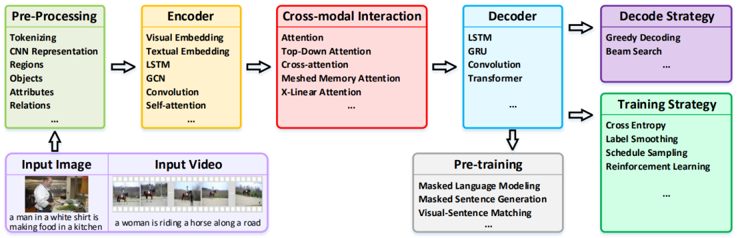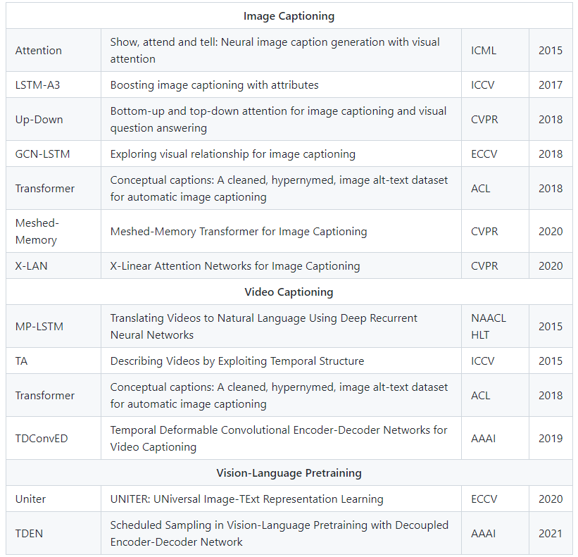 基于这七大模块,X-modaler就可以轻松支持各种多模态任务,如image/video captioning、vision-language pre-training、VQA、VCR、cross-modal retrieval,同时也能很好地复现每个多模态任务中的前沿技术,例如在image captioning的任务中X-modaler集成了京东AI团队从ICCV17的LSTM-A、ECCV18的GCN-LSTM、再到CVPR20的X-LAN。目前代码库支持的算法如下图,后续将不断加入更多最新技术的实现,整个代码库包括使用文档以及预训练模型均已开源(https://github.com/YehLi/xmodaler)。
