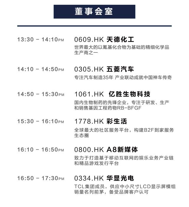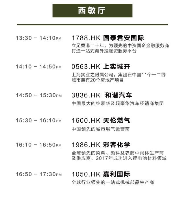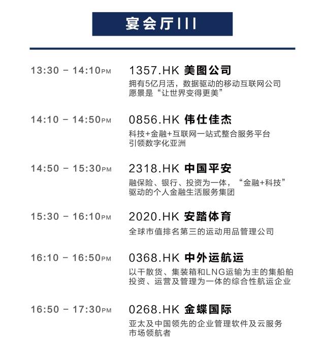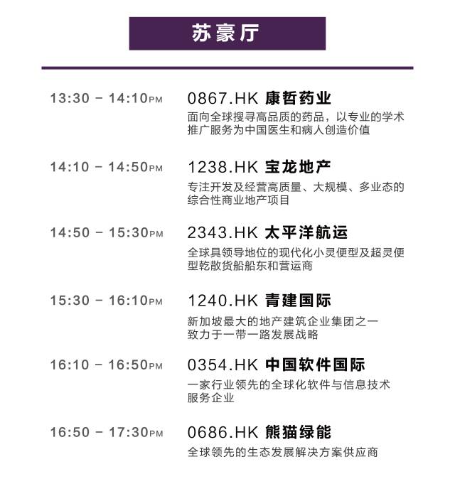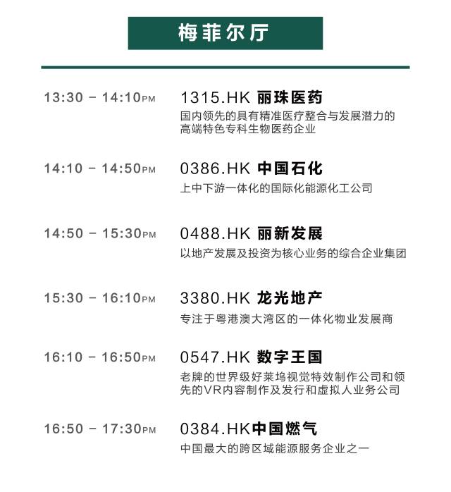 峰会首站,我们将带领36家优秀的上市公司汇聚一堂,每家公司将进行40分钟的路演及Q&A互动,各位机构投资者及高净值个人投资者将有机会与中国平安、中国石化、中国燃气、金蝶国际、龙光地产、安踏体育、康哲药业、丽珠医药、美图公司等广大投资者喜爱的港股上市公司,直接面对面沟通,我们将好公司,一网打尽。