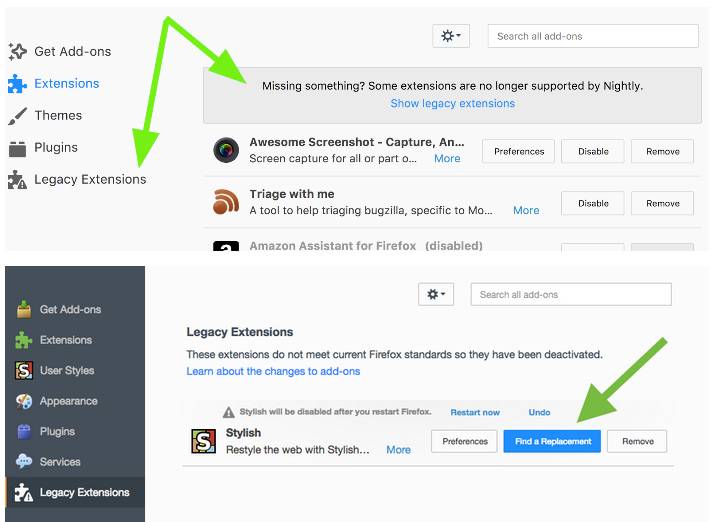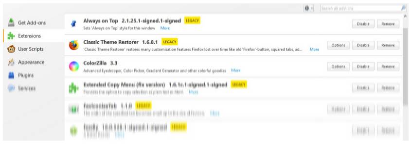 至于实际的迁移过程,当用户更新到 Firefox 57 时,他们只会在加载项部分看到基于 WebExtensions 的新扩展,而旧的将被移动到一个名为“Legacy Extensions“的分组下。 如图所示: