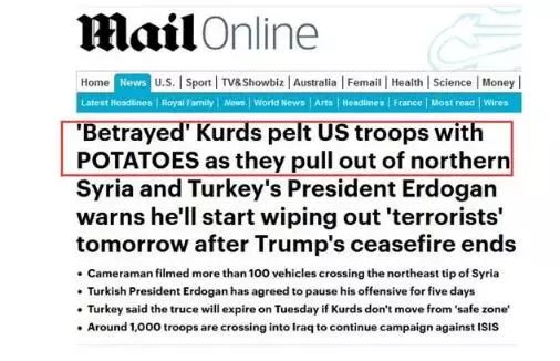 多家外媒10月21日曝光了一段美军从叙利亚撤离并前往伊拉克的视频,内容为:库尔德人所控制的城市民众拿土豆砸美军军车。