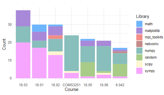通过统计每门课程所使用的Python编程包,可以看到所有课程都使用NumPy和Sympy。Matplotlib只在有需要绘图的问题的课程中使用。大约有一半的课程使用math、random和SciPy。在实际运行的时候,研究人员只指定SymPy或绘图相关的包导入,其他导入的包都是自动合成的。