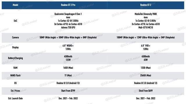 据 91mobiles 此前报道,realme GT2 Pro 预计将配备一块 6.51 英寸 FHD+Super AMOLED 屏幕,后置为三摄设计,包括一颗 1.08 亿像素主摄、800 万超广角镜头以及一颗 500 万镜头(具体用途未知)。realme GT2 Pro 内置 5000mAh 容量电池,支持 125W 快充,搭载基于 Android 12 打造的 realme UI 3.0。该机目前正在研发中,并预计在明年第一季度亮相。