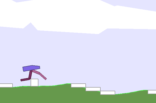 Hardcore version of 'BipedalWalker-v2' with ladders, stumps, pitfalls. Time limit is increased due to obstacles. Reward is given for moving forward, total 300+ points up to the far end. If the robot falls, it gets -100. Applying motor torque costs a small amount of points, more optimal agent will get better score. State consists of hull angle speed, angular velocity, horizontal speed, vertical speed, position of joints and joints angular speed, legs contact with ground, and 10 lidar rangefinder measurements.