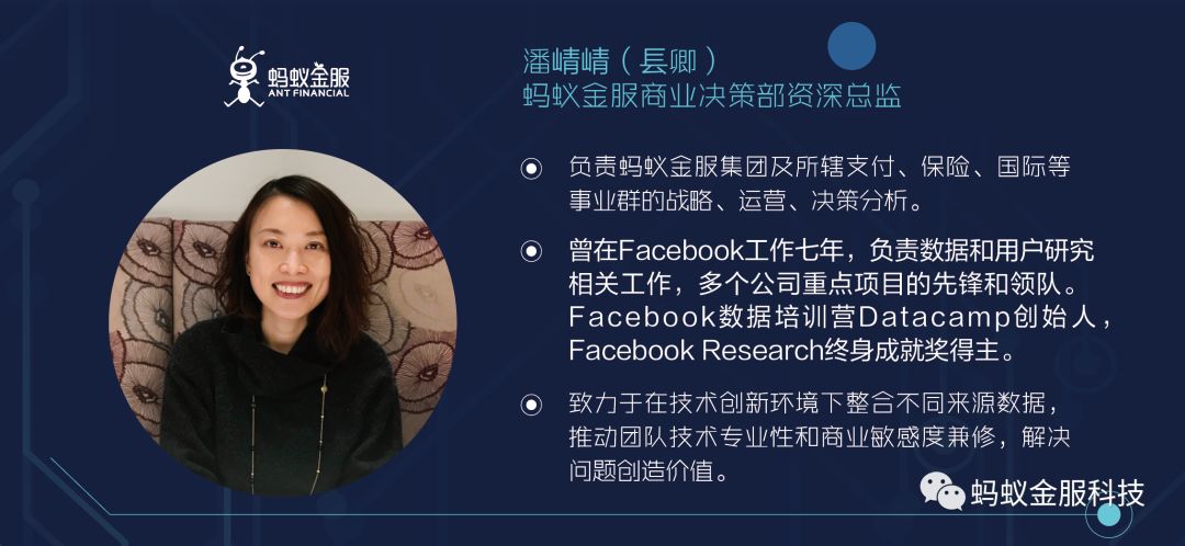 在科技进步越来越快,商业环境越来越复杂的环境下,如何实现合作过程中“1+1>2”的效果?在蚂蚁金服做数据分析工作和其他科技公司有什么样的差异?而蚂蚁金服有会更看重什么样的数据人才特质呢?带着这些问题,小蚂蚁邀请到了来自蚂蚁金服的三位嘉宾来和大家探讨AI和BI相遇的可能性,他们是蚂蚁金服商业决策部的资深总监潘崝崝(花名:镸卿);蚂蚁金服人工智能部资深总监徐鹏(花名:无改)和蚂蚁金服人工智能部和国际人工智能团队资深总监蒋松(花名:兜率)。一起来看下现场会碰撞出什么样的火花吧!