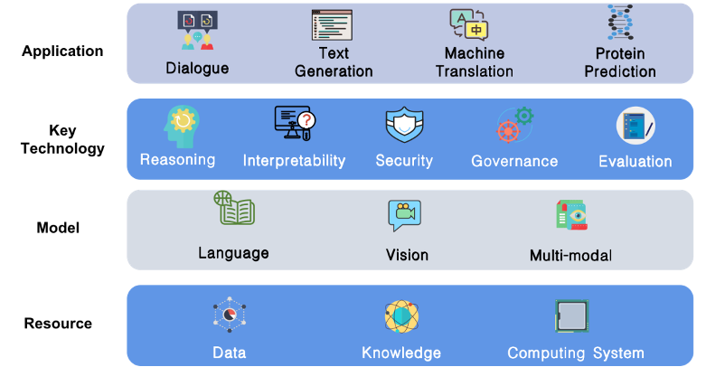 《A Roadmap for Big Model》由悟道大模型研究项目负责人,智源学术副院长,清华大学计算机系教授唐杰牵头,从大模型基础资源、大模型构建、大模型关键技术与大模型应用探索4个层面出发,对15个具体领域的16个相关主题进行全面介绍和探讨。下图给出了文章的整体框架结构和15个领域的具体内容。其中,资源层的计算系统领域中,除了对系统本身的介绍外,还包括了独立的并行计算章节,因此总计形成了16个主题。下面,我们将对文章的每个主题内容进行简要的介绍和概括。(点击阅读原文即可下载查看报告)